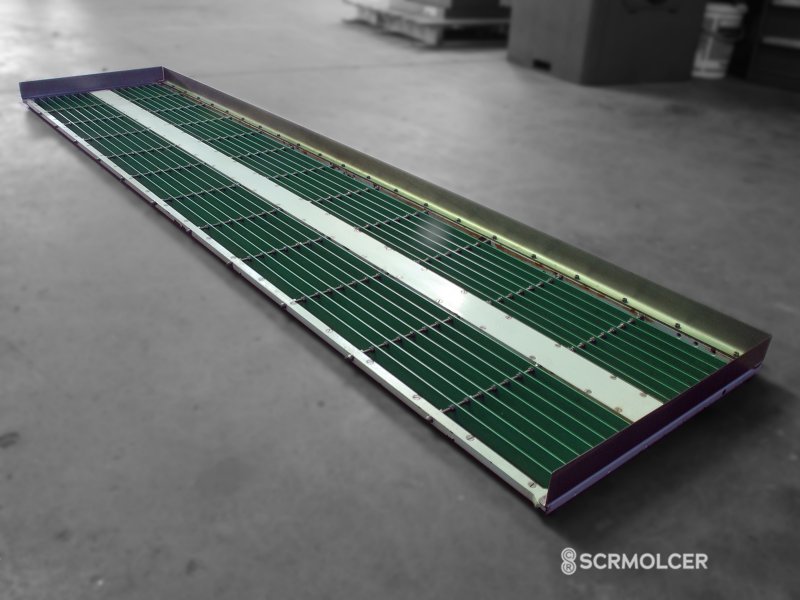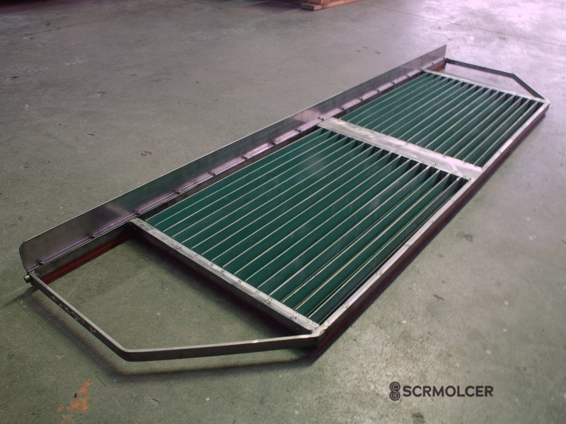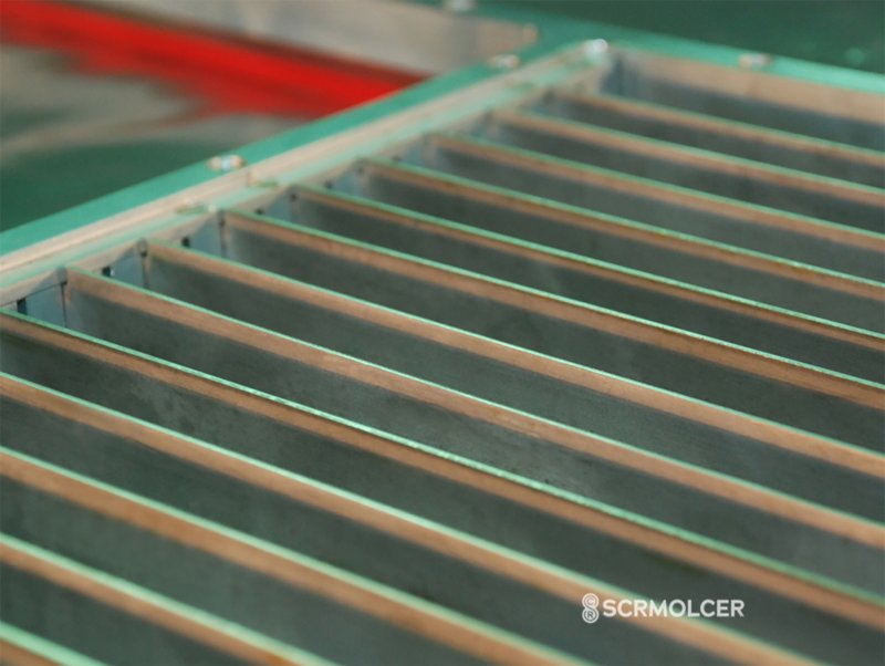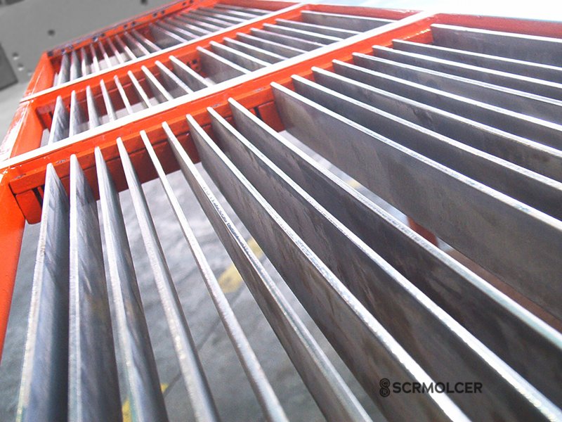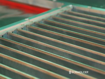 Estas grelhas podem ter lamelas unicamente em inox ou também revestidas de teflon. Este revestimento a teflon é utilizado para evitar a acumulação de pó nas lamelas durante o processo de carregamento.